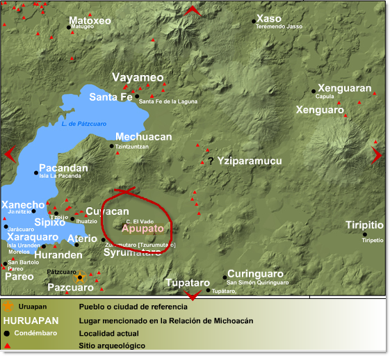 "... Isla del lago de Pátzcuaro en donde el Cazonci (Zinzicha) tenía tesoros: "diez arcas de plata fina en rodelas, en cada arca doscientas rodelas y mitras para los cativos que sacrificaban, y mil e seiscientos plumajes verdes Curícaberi; otros tantos la diosa Xarátanga y otro su hijo Manóvapa, y cuarencta jubones de pluma rica y cuarencta de pluma de papagayos. Estos habían puesto allí sus bisagüelos del cazonci [es decir, Hiripan y Tangaxoan]". Cuando Zinzicha regresa de Uruapan, manda por la plata y el oro que estaba en Apúpato para satisfacer las demandas de Olid. Con ello hicieron sesenta cargas que llevaron a México junto con lo recolectado en otros lugares ...". Texto integro del libro La relación de Michoacán.