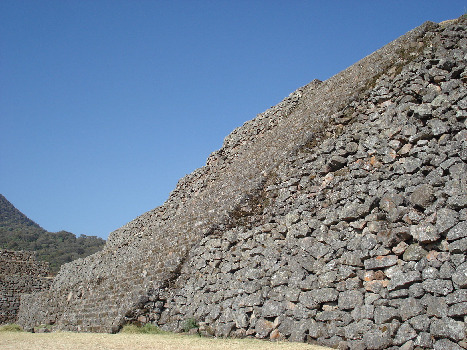 Es de base rectangular, construida a base de un núcleo de tierra y piedra, recubierto con lajas sin cementante. Mide 87 metros de largo; 37.5 de ancho y 1.5 de alto. Sobre ella se construyeron las siguientes estructuras.