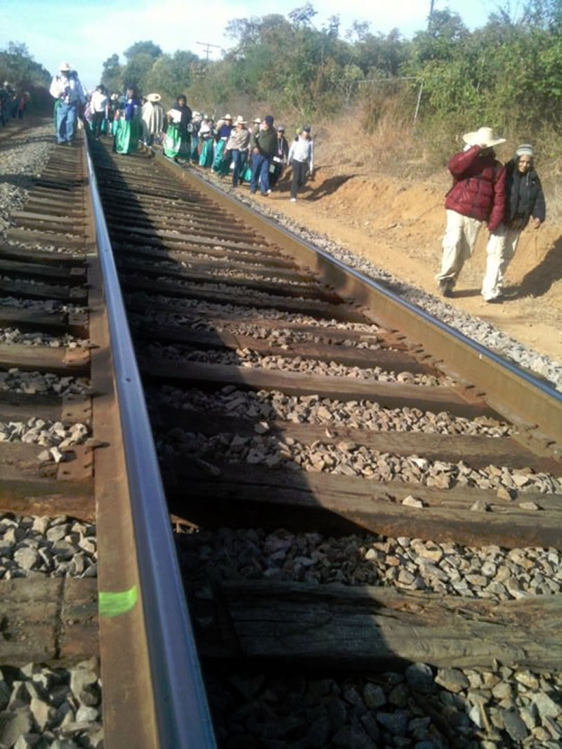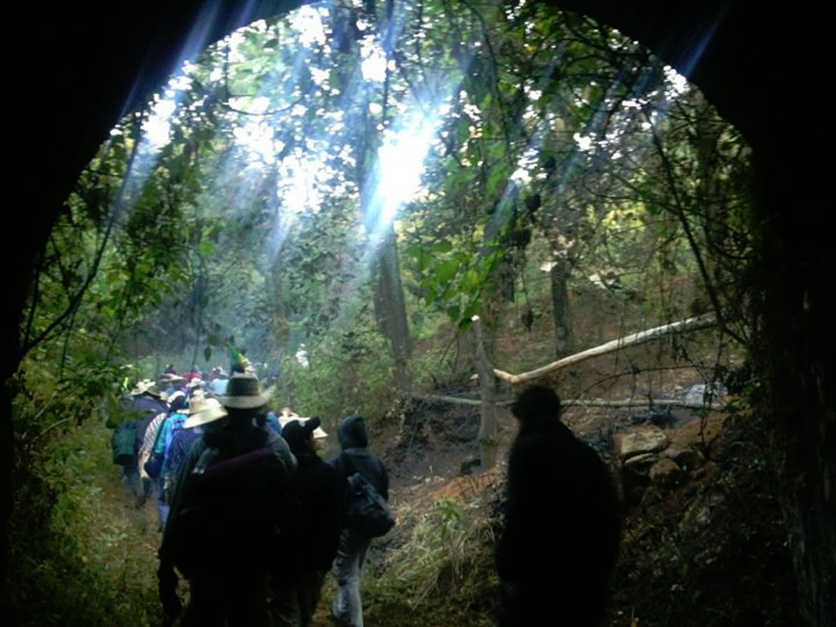 Saliendo de un túnel de tren, la caravana que traslada el Fuego Viejo a Jaracuaro, donde en la noche del 1 de febrero se encenderá el Fuego Nuevo.