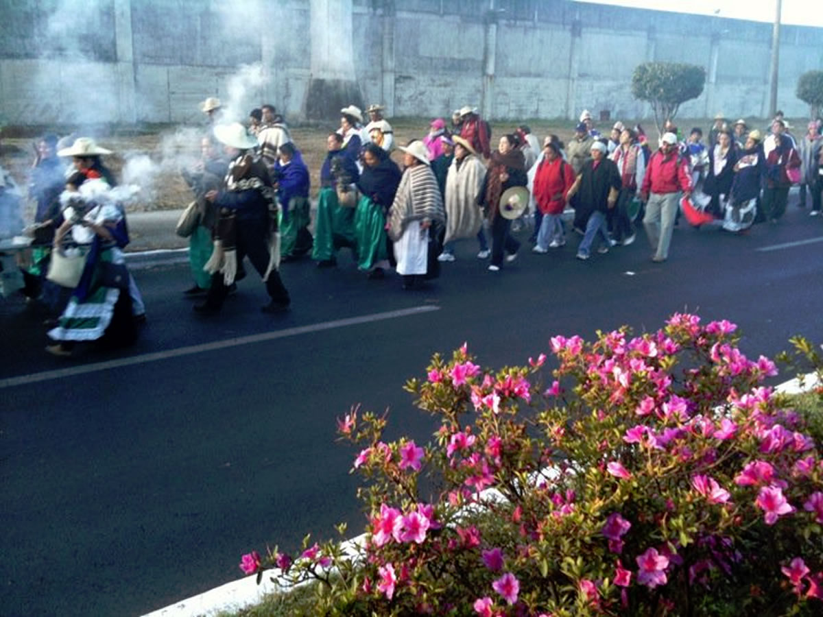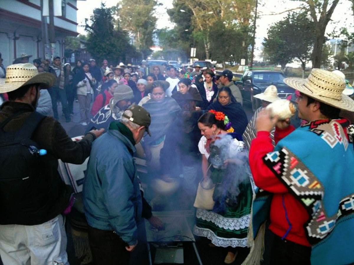Después de dos horas de camino, a las 8:00' hrs. llegó a Caltzontzin la comitiva de barrios de Uruapan, portadora del fuego nuevo purépecha, rumbo a Jarácuaro.