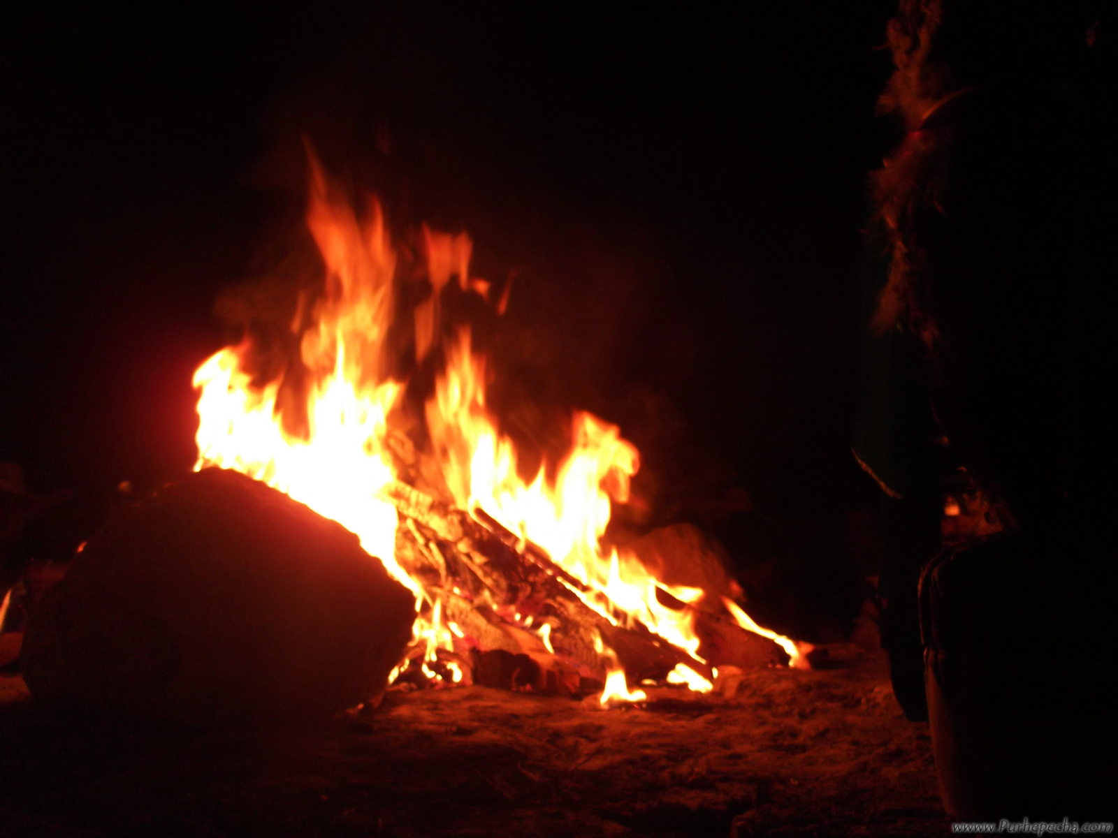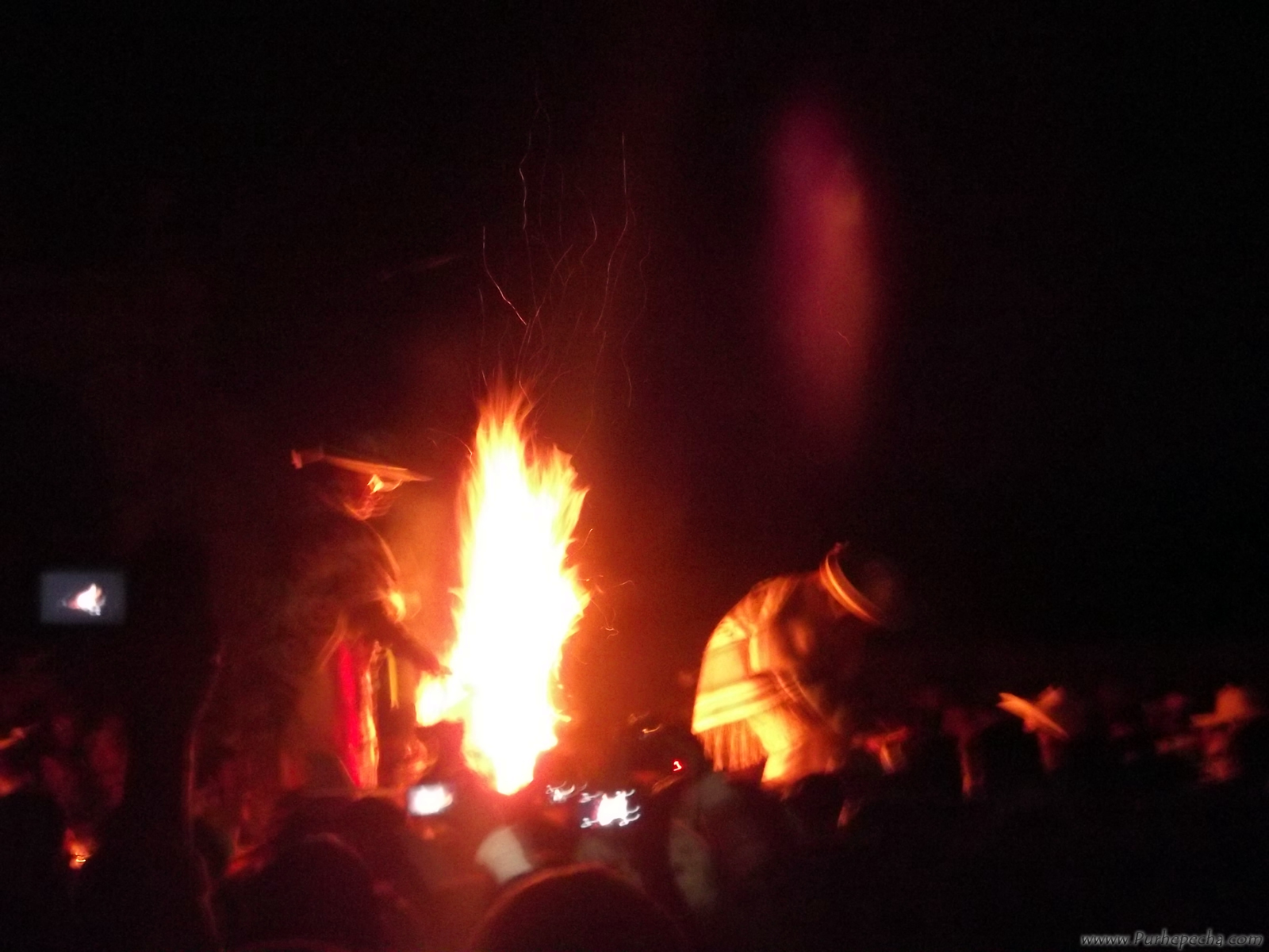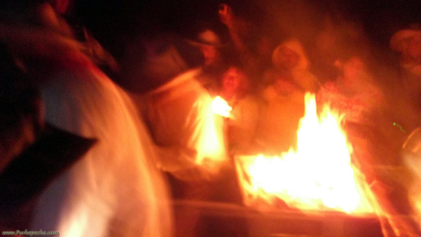 Y alrededor 12 de la media noche, cuando la constelación de orión (Jaráru josku) estuvo a mitad de su trayecto en el cielo, y utilizando la técnica ancestral y tradicional de frotamiento de piedras especiales se procedió a prender el fuego sobre yesca y con ello se renovó de nueva cuenta nuestro Ch’jpiri Jimbani (Fuego Nuevo), y con ello iniciamos nuestro nuevo año P’urhépecha (Juchari Jimbani uéxurini). Los gritos de la gente no se hicieron esperar, sonó la música, algunos lloraron de alegría, la gente bailó de júbilo por el nacimiento y renovación de nuestro Fuego sagrado. Mucha gente agarró ocote de pino y lo prendió para llevarse el nuevo Fuego a sus hogares, comunidades y pueblos.