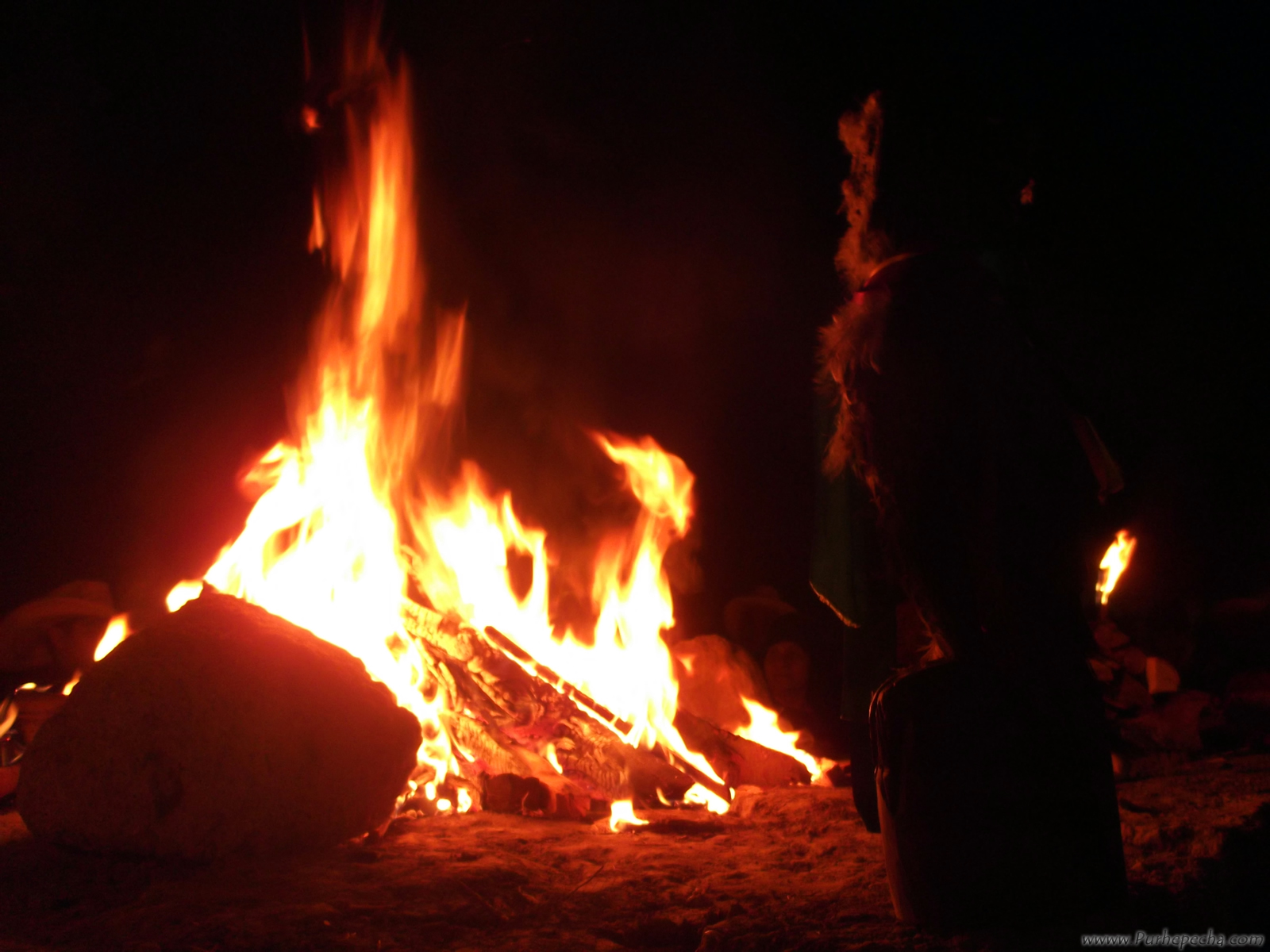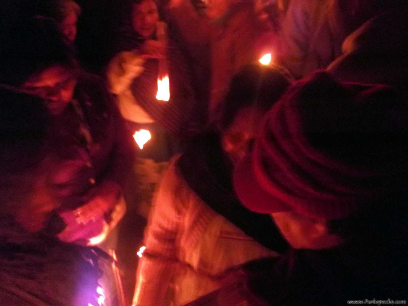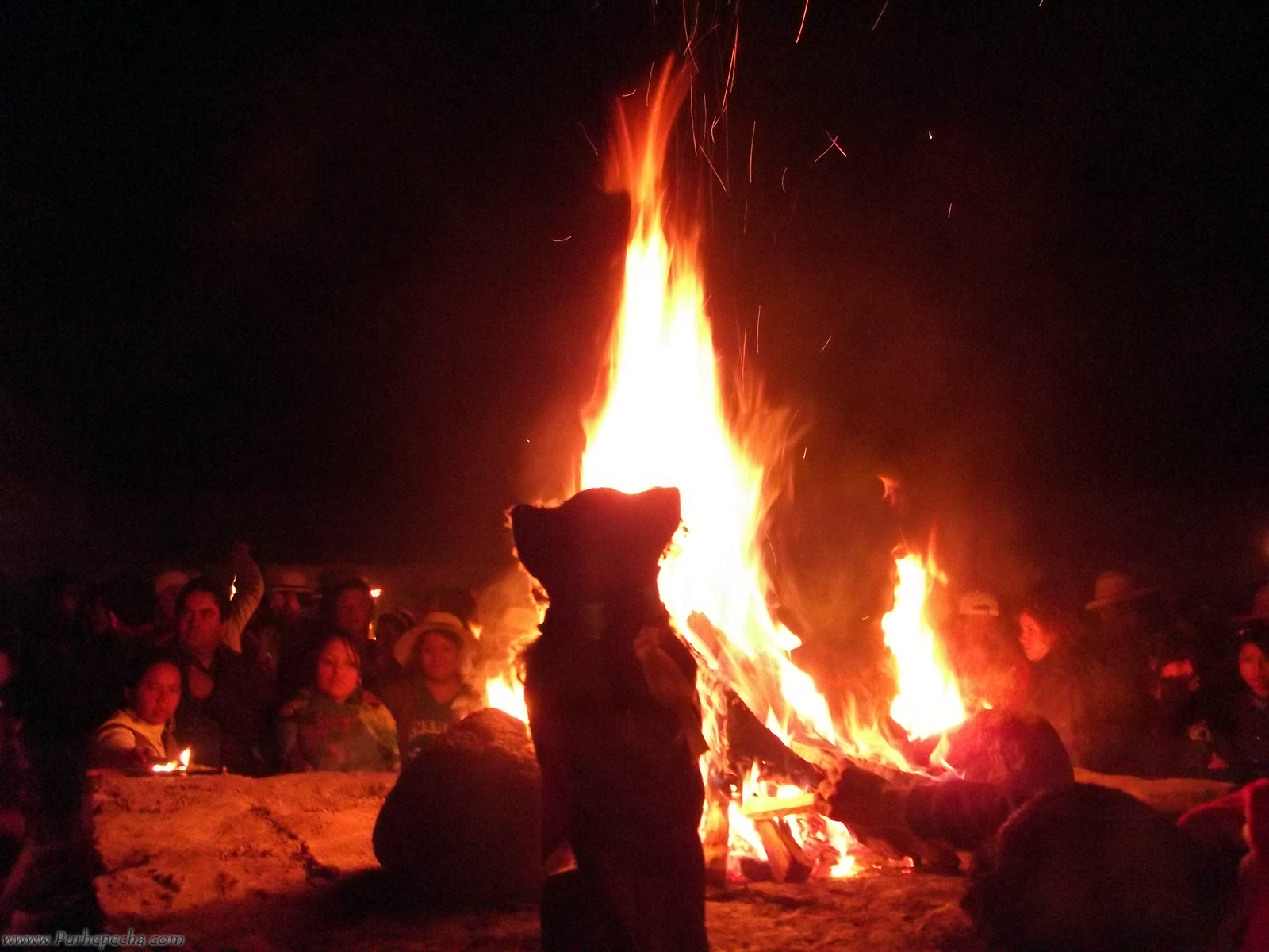 Y alrededor 12 de la media noche, cuando la constelación de orión (Jaráru josku) estuvo a mitad de su trayecto en el cielo, y utilizando la técnica ancestral y tradicional de frotamiento de piedras especiales se procedió a prender el fuego sobre yesca y con ello se renovó de nueva cuenta nuestro Ch’jpiri Jimbani (Fuego Nuevo), y con ello iniciamos nuestro nuevo año P’urhépecha (Juchari Jimbani uéxurini). Los gritos de la gente no se hicieron esperar, sonó la música, algunos lloraron de alegría, la gente bailó de júbilo por el nacimiento y renovación de nuestro Fuego sagrado. Mucha gente agarró ocote de pino y lo prendió para llevarse el nuevo Fuego a sus hogares, comunidades y pueblos.