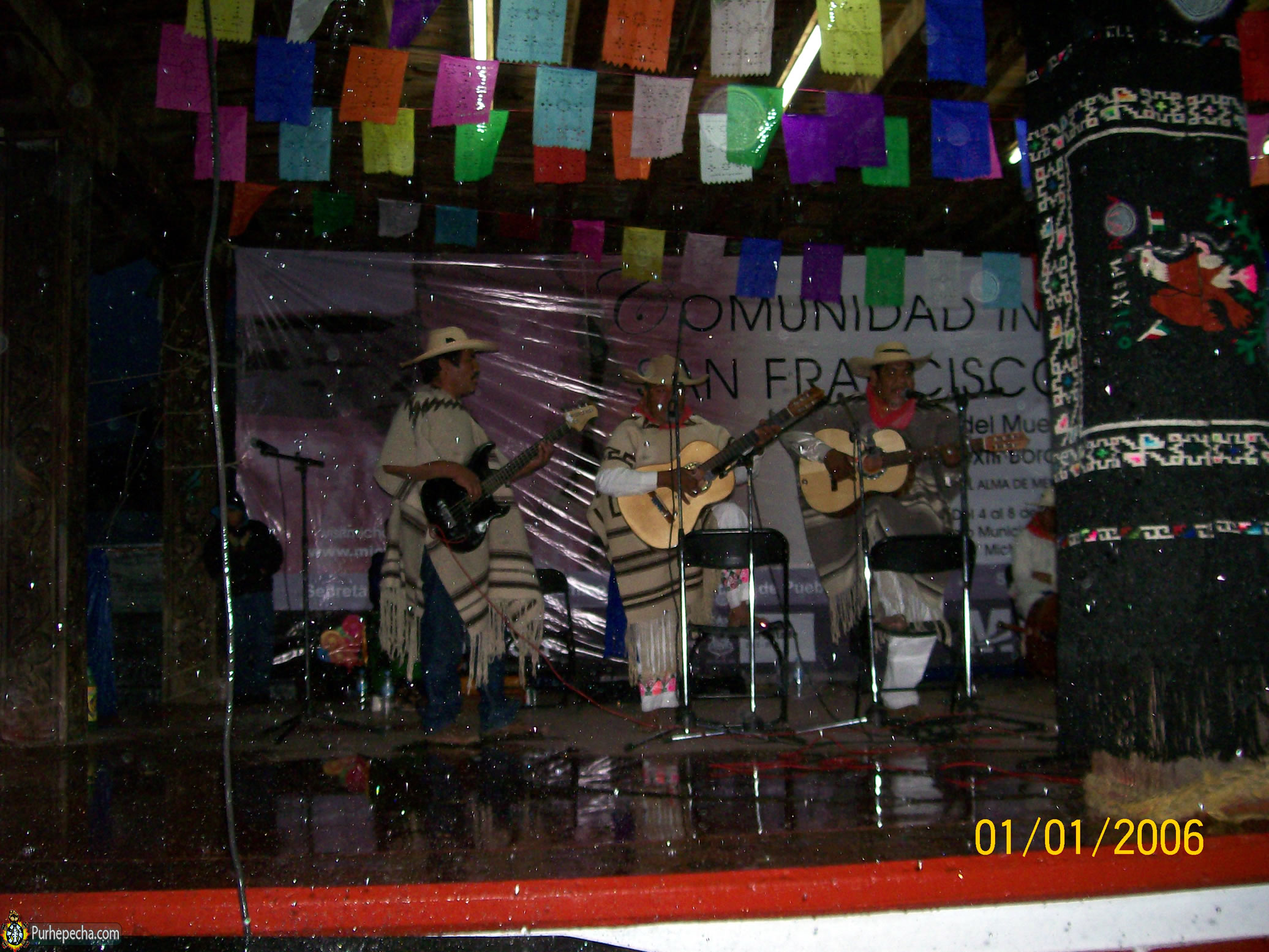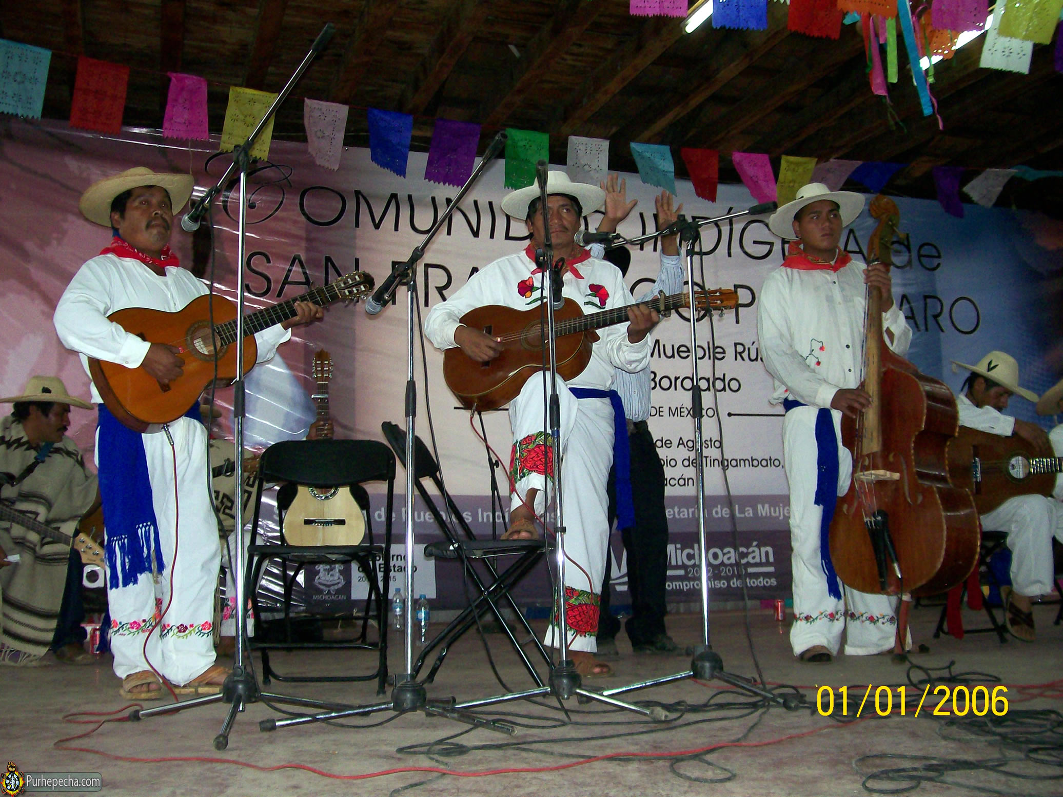 Los Chapas alternaron con el dueto “el jilguero y el gorrión” de Tarecuato, Juan Pablo Ruíz y Jesús Blas, acompañados por un compañero del que no obtuve su nombre – disculpas- que tocó un bajo eléctrico. Llevó un buen rato conectar y hacer sonar el bajo por problemas técnicos, confusiones con el cablerío. Cuando al fin cantaron, fue muy grato escuchar las voces igual que hace ya, muchos años atrás: nítidas, brillantes, buena afinación, cantando pirekuas muy evocadas. En mi opinión, creo que hasta sale sobrando el bajo, que además al ser eléctrico, su volumen era fuerte y los errores de ejecución son más nítidos y audibles, por ejemplo al irse a un tono equivocado, lo que hace que la ejecución se desvirtúe; realmente el dueto solo, es más que suficiente y buenísimo. Vino un tercer grupo de Tarecuato, los Jilgueros con Isidro Blas, Juan Pablo Ruíz en las voces y dos guitarras, asi como el hijo de Isidro, Jesús Blas con el tololoche (o contrabajo). Noche evocativa de juventud, porque volvimos a escuchar también sus bellas pirekuas, con sus peculiares requinteos propios de estos grupos de Tarecuato.