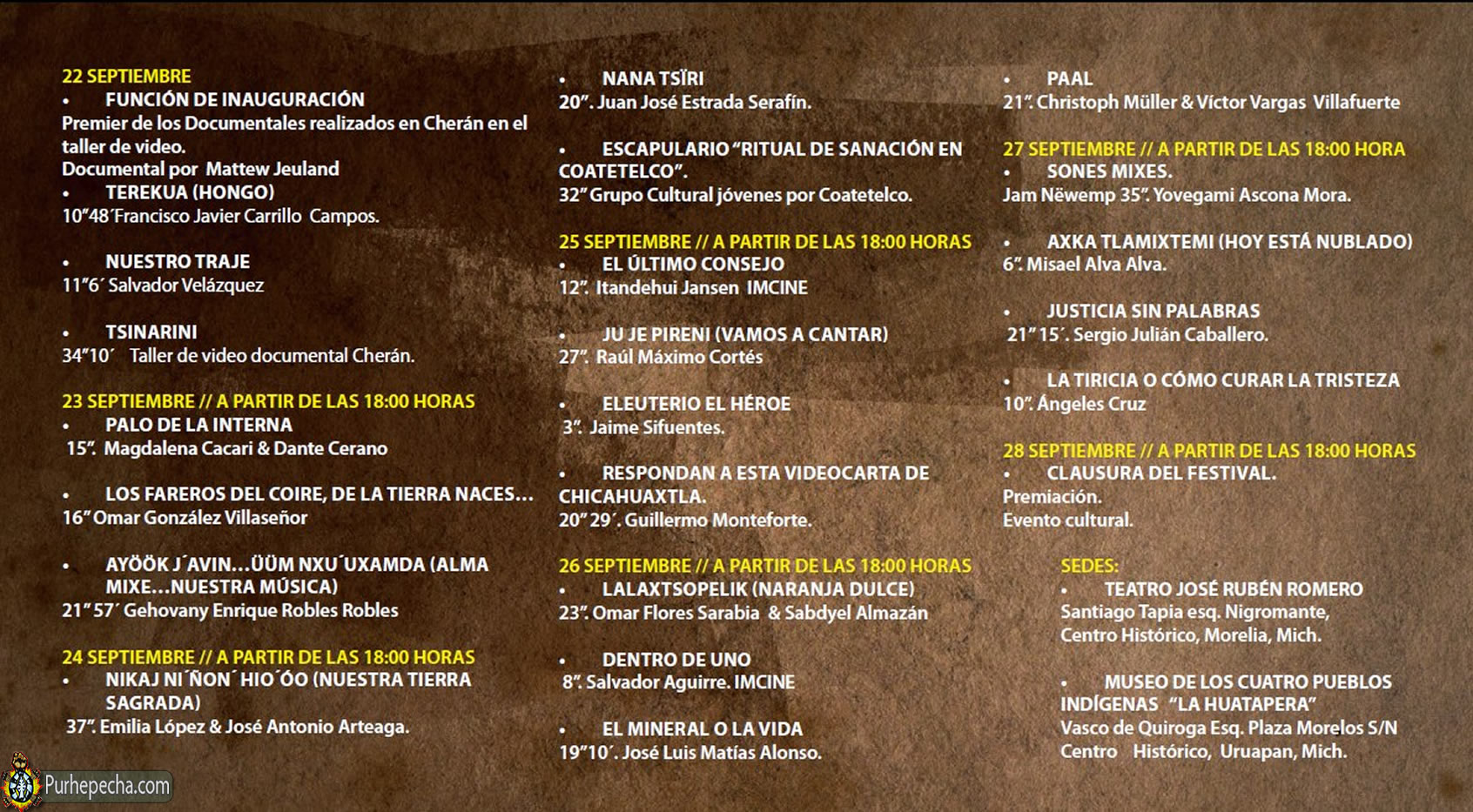 El Festival de Cine y Video Indígena comenzó en 2005 en los municipios de Morelia y Uruapan, pero actualmente también se presenta en entidades como Estado de México, Querétaro, Hidalgo, San Luis Potosí, Nuevo León y Ciudad de México; ahora en su octava edición se llevará a cabo del 22 al 28 de septiembre en la capital y los trabajos serán exhibidos en el Teatro Jesús Romero Flores.
