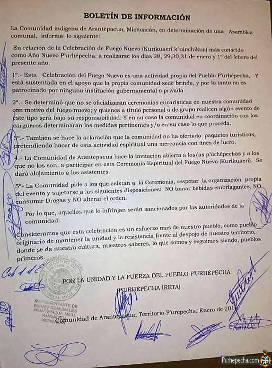 - 4º.- La comunidad de Arantepacua hace la invitación abierta a las y los P’urhépecha, y a todos los que no lo son, a participar en esta Ceremonia Espiritual del Fuego Nuevo (Kurhíkuaeri). Se dará alojamiento a los asistentes.