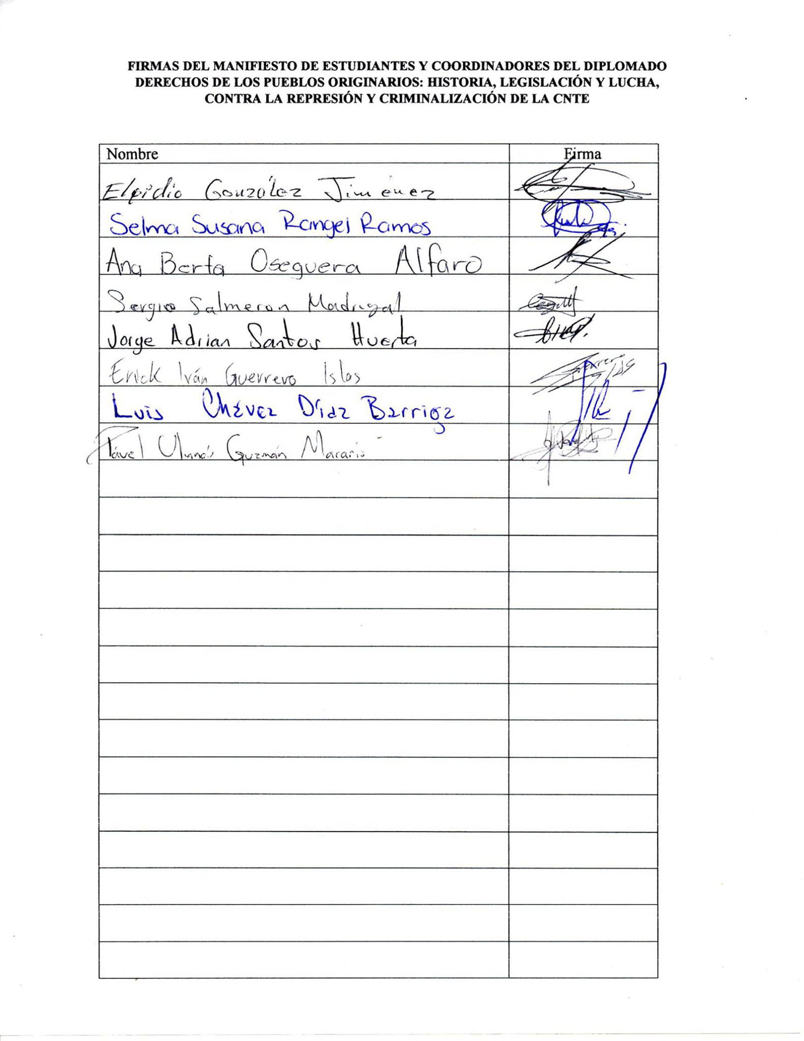 Ante el contexto actual de represión contra los movimientos sociales por parte del Estado mexicano, y en particular, del movimiento magisterial en defensa de la educación, las y los compañeros asistentes y coordinadores del diplomado DERECHOS DE LOS PUEBLOS ORIGINARIOS: HISTORIA, LEGISLACIÓN Y LUCHA, diplomado interinstitucional, gratuito y organizado en comunidades originarias, nos solidarizamos con la lucha que ha emprendido la Coordinadora Nacional de Trabajadores de la Educación por la abrogación de las “Reformas Estructurales”, que privatizan la educación, el sector energético, y eventualmente el sistema de salud y los recursos hidráulicos. Históricamente, la lucha que ha emprendido el Magisterio Democrático, no sólo es por defender sus derechos laborales, que han sido violentados por el Estado mexicano, sino por la defensa de la educación pública, gratuita y laica.