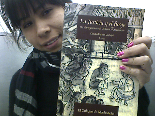 :-j Sólo como un dato para todos, quizá muchos de ustedes efectivamente ya hayan leido "LA RELACIÓN DE MICHOACÁN", para los que ya lo leyerón ay les va, hay un libro que salió hace poco que muchos de ustedes quizá ya an tenido la oprtunidad de leerlo y para los que no, hay les va el titulo de este magnifico libro:( "LA JUSTICIA Y EL FUEGO "dos claves para leer la Relación de Michoacán), la autora Claudia Espejel Carvajal, (COLMICH) editado por El Colegio de Michoacán.