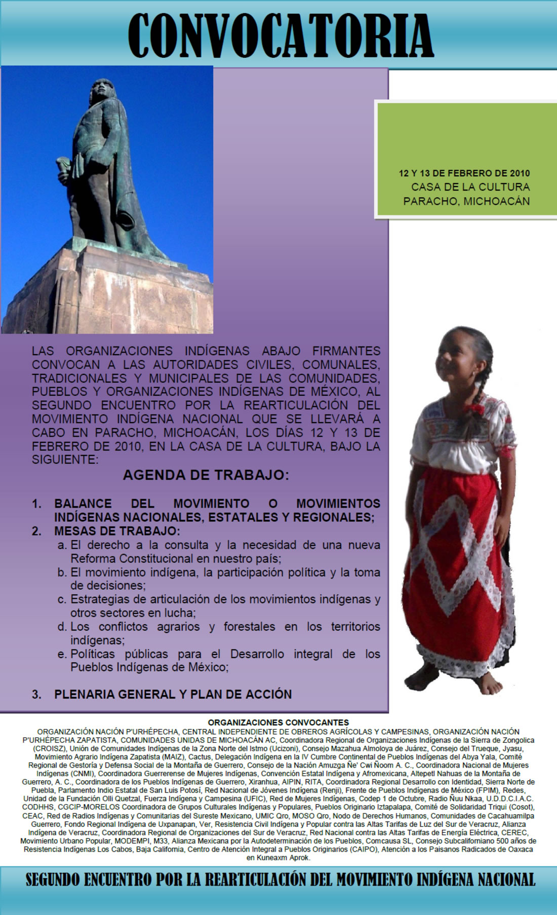 LAS ORGANIZACIONES INDÍGENAS ABAJO FIRMANTES CONVOCAN A LAS AUTORIDADES CIVILES, COMUNALES, TRADICIONALES Y MUNICIPALES DE LAS COMUNIDADES, PUEBLOS Y ORGANIZACIONES INDÍGENAS DE MÉXICO, AL SEGUNDO ENCUENTRO POR LA REARTICULACIÓN DEL MOVIMIENTO INDÍGENA NACIONAL QUE SE LLEVARÁ A CABO EN PARACHO, MICHOACÁN, LOS DÍAS 12 Y 13 DE FEBRERO DE 2010, EN LA CASA DE LA CULTURA, BAJO LA SIGUIENTE: