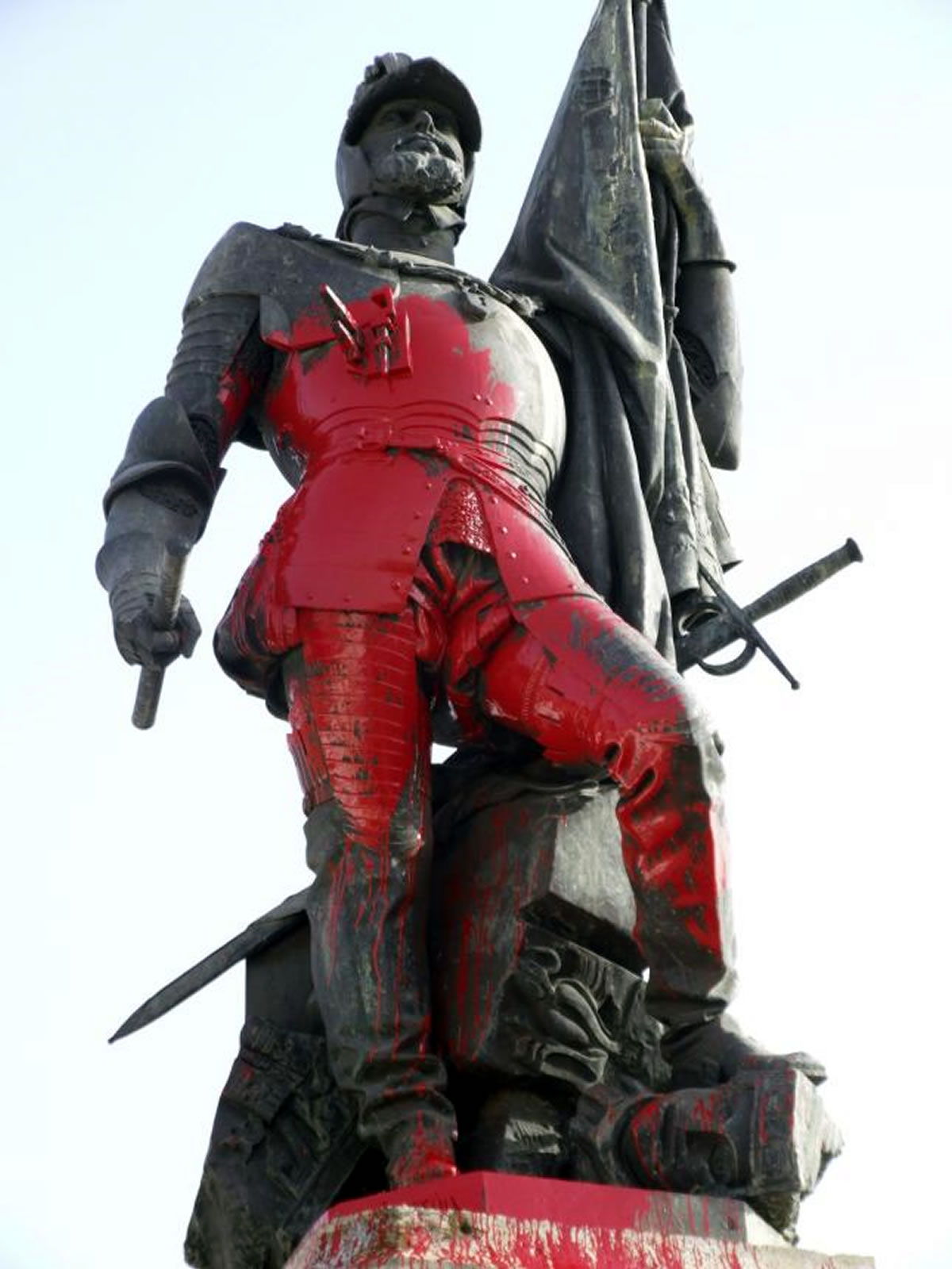 Resulta que el desgraciado monigote, tiene bajo su pata izquierda una cabeza de indígena y se le pavonea con una placa su triunfo de cuatro batallas. ¿Para los españoles eso no es ofensa a nuestro pueblo, a las etnias? ¿es así como muestran su amistad a nuestro México? pero algunos funcionarios y defensores de la colonización y sus 300 años de genocidio, bien vale que manden esquelas por la acción de estos valientes españoles.