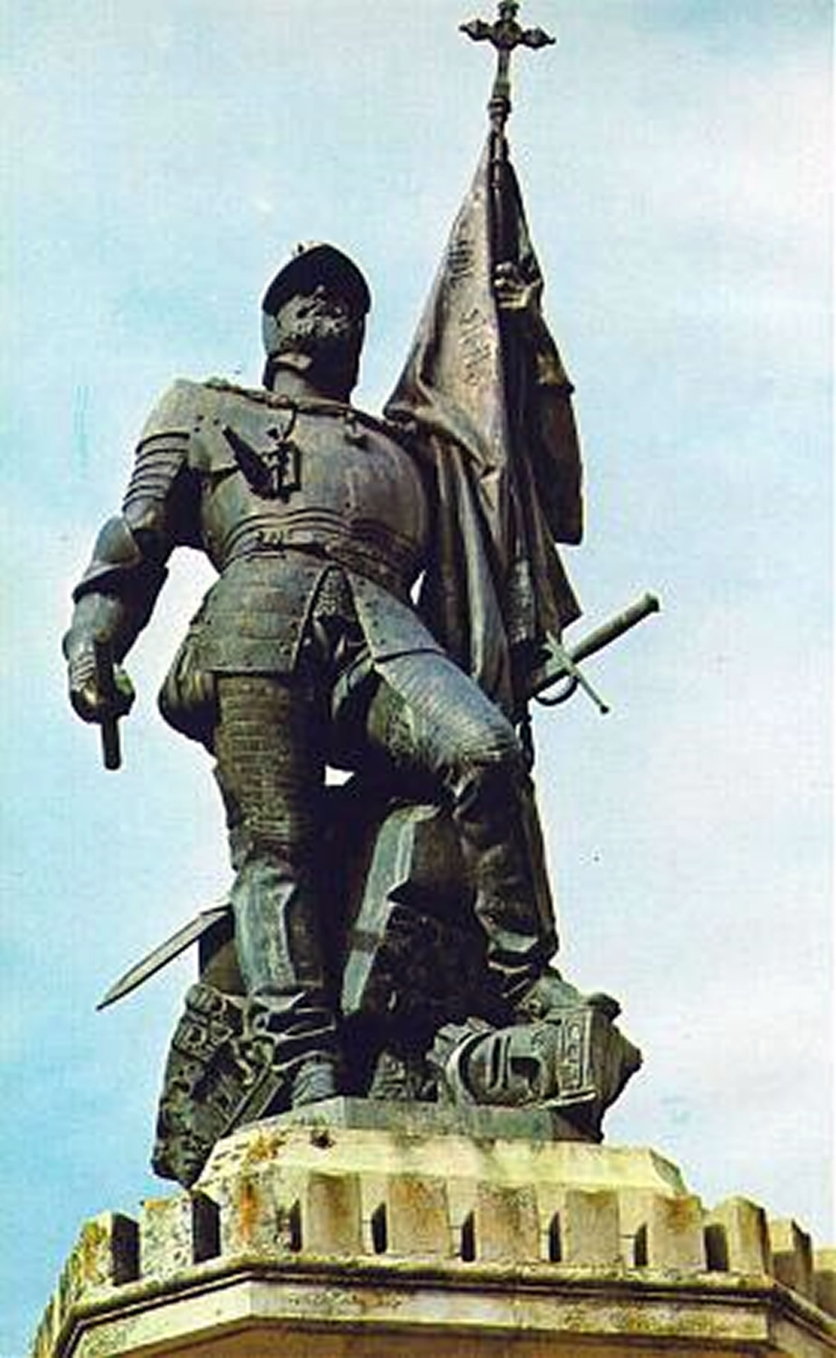 La estatua del "conquistador" Hernán Cortés situada en su pueblo natal, Medellín (Badajoz), España. Vea usted si no es ofensivo, la pata izquierda se posa sobre la cabeza de un "indio".