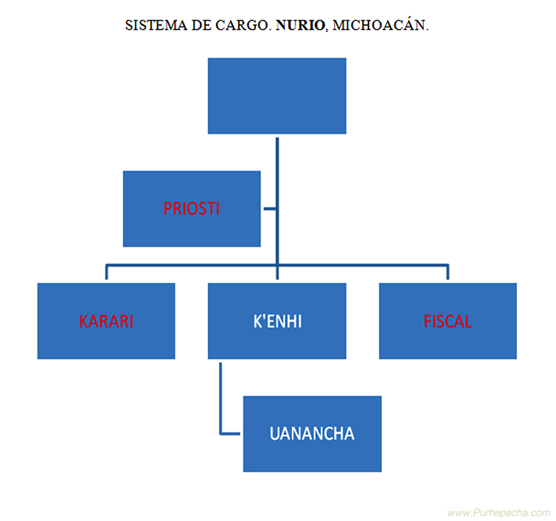 Nurío, comunidad indígena que busca su autonomía política, está representada por el jefe de tenencia y el Representante de Bienes Comunales. Pertenece a la parroquia de Paracho y es muy visitado por sus espacios sagrados. Su población es de 3, 749, refieren sus moradores que sus orígenes datan del periodo prehispánico. La memoria de las ancianas relatan que el sistema de cargos estuvo con los nombramientos de Priasti, karári, k’enhi, fiscal y uanancheecha, sin embargo, nos explicó la señora Carmen, k’enhi de la capilla, que aproximadamente unos veinticinco años a tras se dejó el cargo de prioste, karári y del fiscal, consecuentemente se dejó de realizar la fiesta del carnaval. No se recuerda si existió el cabildo o el mandón, lo que si se tienen en memoria es una tal señora de nombre Carlota y de su esposo Santos Rubio, familia muy rica, quienes hasta su muerte fungieron como Priosti y quienes nombraban a los cargos de la capilla. Algunos de los pobladores refieren que a raíz de la muerte de doña Carlota los cargos se perdieron. En la actualidad existe únicamente el cargo de k’enhi y de las uanacha, el primero es nombrado por la asamblea comunal como también la pareja encargada del templo. Mientras que las uanancha siguen siendo nombradas por el k’enhi. En el cargo de las uanancha existen siete señoritas, cuatro de ellas son las responsables de la imagen de la Concepción; una es pendona pari , otra candela pari y una más como xunhanda pari.