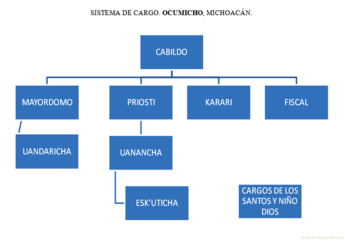 El sistema de cargos basado en el Cabildo (26), llamados Acha k’eraticha, con un jefe de cabildo denominado Mandón o Alcandi (Alcalde), éste último cuenta con un ayudante llamado Meyuri. En la estructura de la capilla-hospital existe un Priosti (Prioste), un K’enhi y cuarenta cinco uanancheecha, divididas en nueve conjuntos, cada grupo de cuatro mujeres y de una niña denominada pendona pari (niñas de seis años). En el templo existe un fiscal quien se encarga de ese espacio como en la atención del sacerdote.