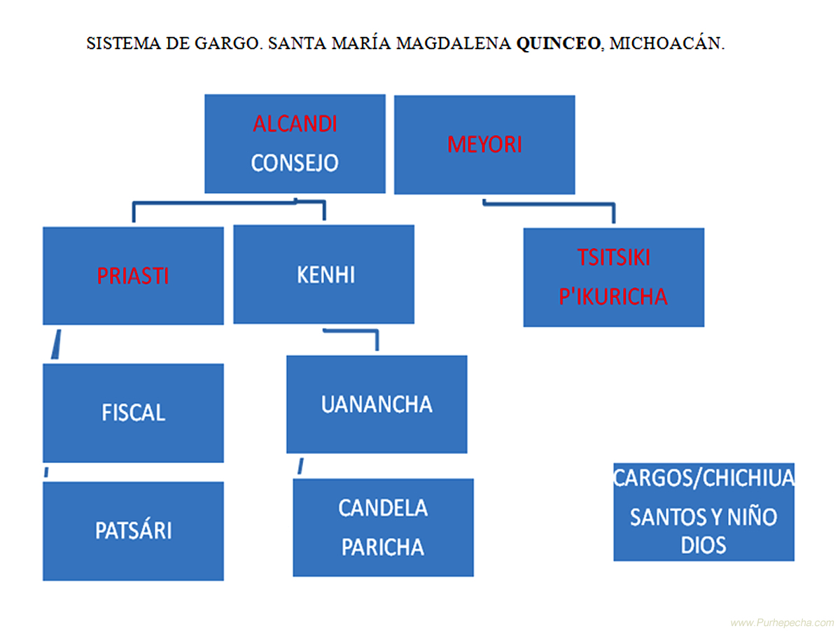El sistemas de cargo en la comunidad de Quinceo, refirieron los entrevistados, que es particularmente dar un servicio, en palabras propias de los lugareños es: káskunhani/asignación; ansïperata/encomienda; jarópekua/ayuda, marhokuni/servir.