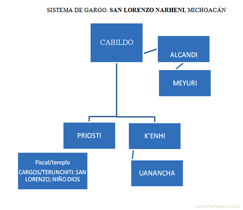 En la actualidad el sistema de cargos está basado en el Consejo, cuatro matrimonios, de los cuales uno es presidente del concejo. Sin embargo, únicamente viven dos parejas que fungen como consejo. Hoy se puede encontrar a cuatro K’enhicha que se dividen de la siguiente manera: k’enhi k’eri, tsimanda, taninda y sapichu. El trabajo de los cargos de k’enhi lo van rotando por semana, así mismo, cada k’enhi nombra a cinco señoritas para que asuman el trabajo de uanancha. En la actualidad sigue existiendo un fiscal como responsable de las oficinas del templo y 31 matrimonios denominados patsáricha (patsári/cuidador o guardián). Así como de veinte uanacheecha, cuatro llamadas naná orheti o pendoneras y de numerosas niñas denominadas como candela paricha; que son las que llevan velas en cada ceremonia. Refirieron las uanancha que existen aún cinco kutsímincheecha, ancianas que años atrás fungieron de priosta y que son las que aún ayudan a buscar las uanancha a los k’enhi, sin embargo, han perdido la autoridad que tenían muchos años atrás.