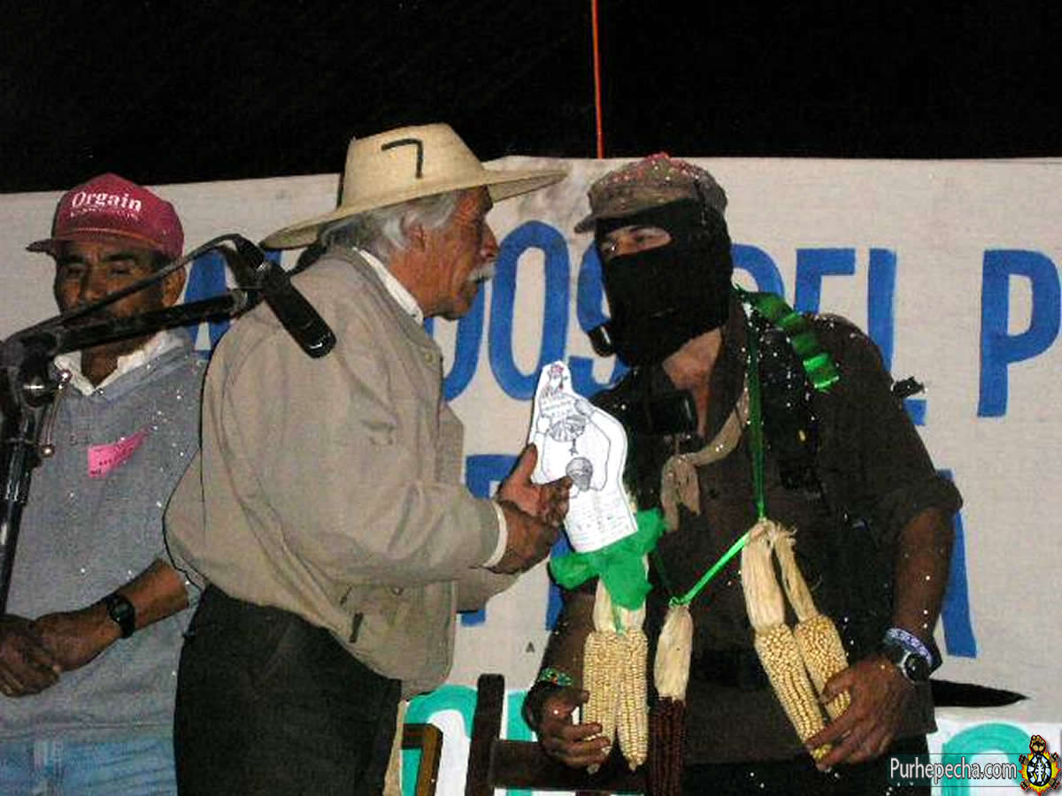 MINTSIKUARHÍA TATA JUAN CHAVESÏ. “Ve a casa del Purépecha, hermano mayor y grande grandeza hermana. Con respeto a él usa la palabra. Saluda a quien obedeciendo en esas tierras manda. Dale nuestro abrazo a todo ese pueblo que orgullo da al color de la tierra y con respeto pídele el permiso para la palabra. Si no hay permiso, baja la cabeza y calla. Si hay permiso, baja la cabeza y habla. Háblalo a su corazón principal. Pide ahí abrigo y posada…” Palabras de Subcomandante Marcos. Nurio, marzo 3, del 2001.