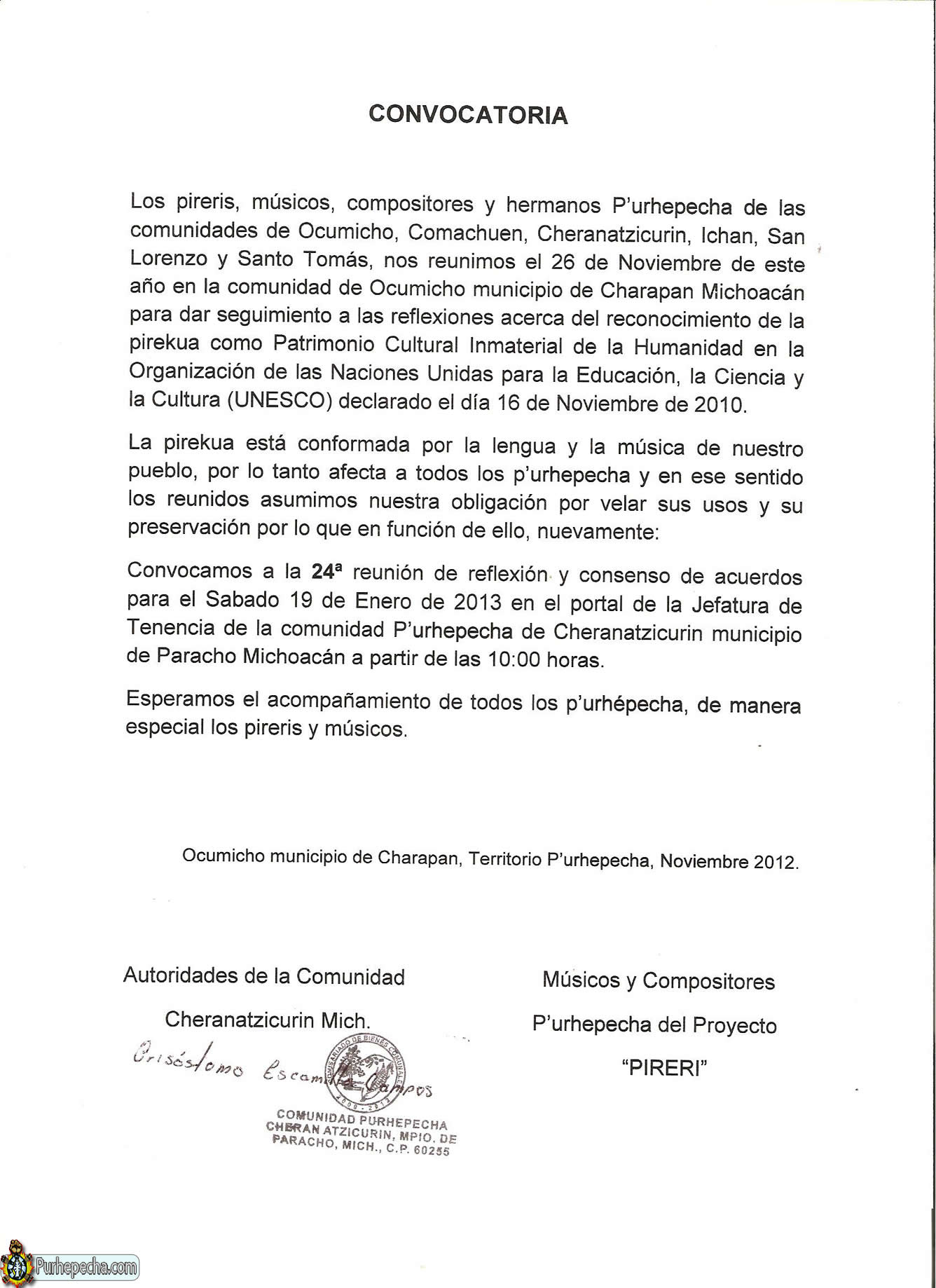 Convocamos a la 24ª reunión de reflexión y consenso de acuerdos para el Sábado 19 de Enero de 2013 en el portal de la Jefatura de Tenencia de la comunidad de Cheranatzicurin, Municipio de Paracho, Michoacán, a partir de las 10:00 horas de la mañana.