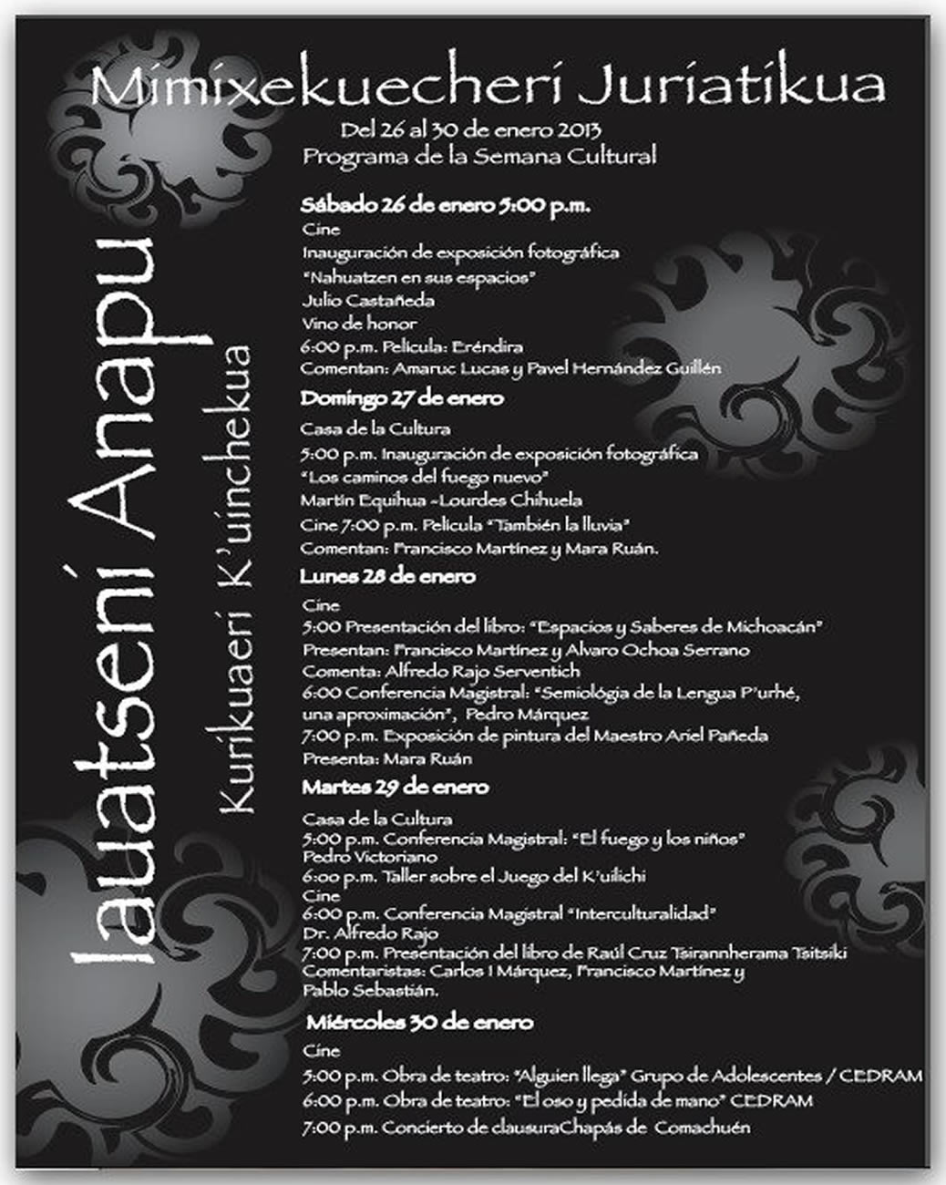 Programa de la Semana Cultural de Kurhikuaeri K'uinchekua en Nahuatzen, Michoacán, México Programa de la Semana Cultural de Kurhikuaeri K'uinchekua en Nahuatzen, Michoacán, MéxicoMIMIXEKUECHERI JURIATIKUA