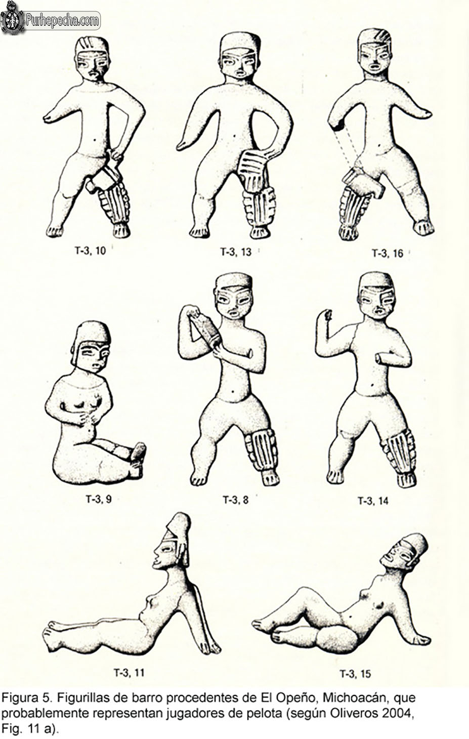 En las figurillas de El Opeño, los jugadores sujetan con la mano una especie de bastón, con protectores en las piernas y una banda en la cabeza, las tres mujeres se encuentran desnudas portando solamente una banda, acompañan a los jugadores prehispánicos.